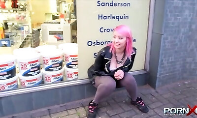 Kinky rosy haired emo girlie in taut yoga pants pisses outdoors for dude