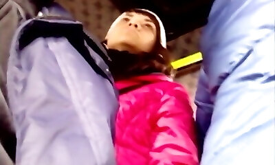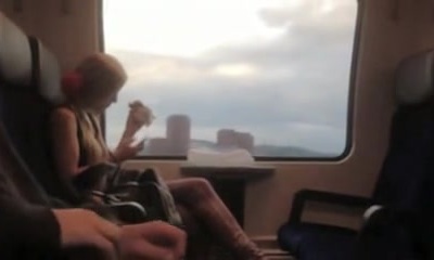 Slutty Russian black-haired got some spunk on her face by a stranger in a train
