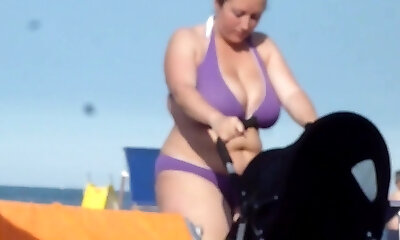 2 sexually aroused daddies jerk off to a buxom mommy at the beach of Cap d'Agde